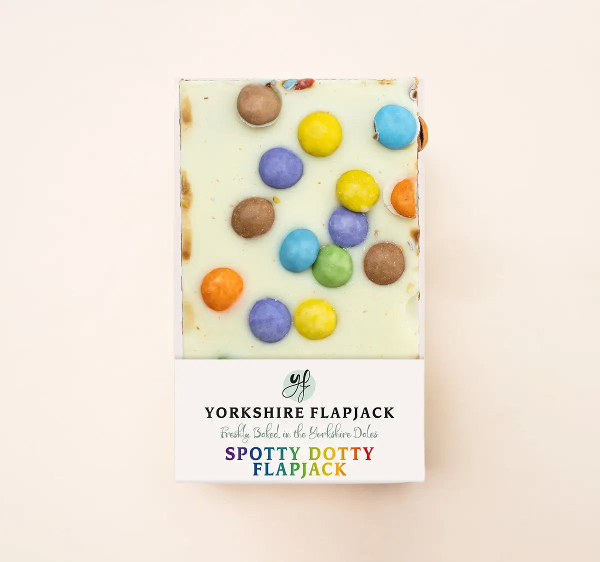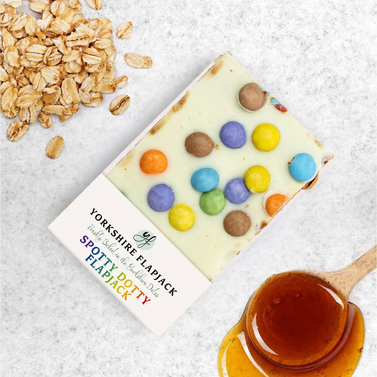 An oat base flapjack topped with a white chocolate flavour coating and mini smarties.